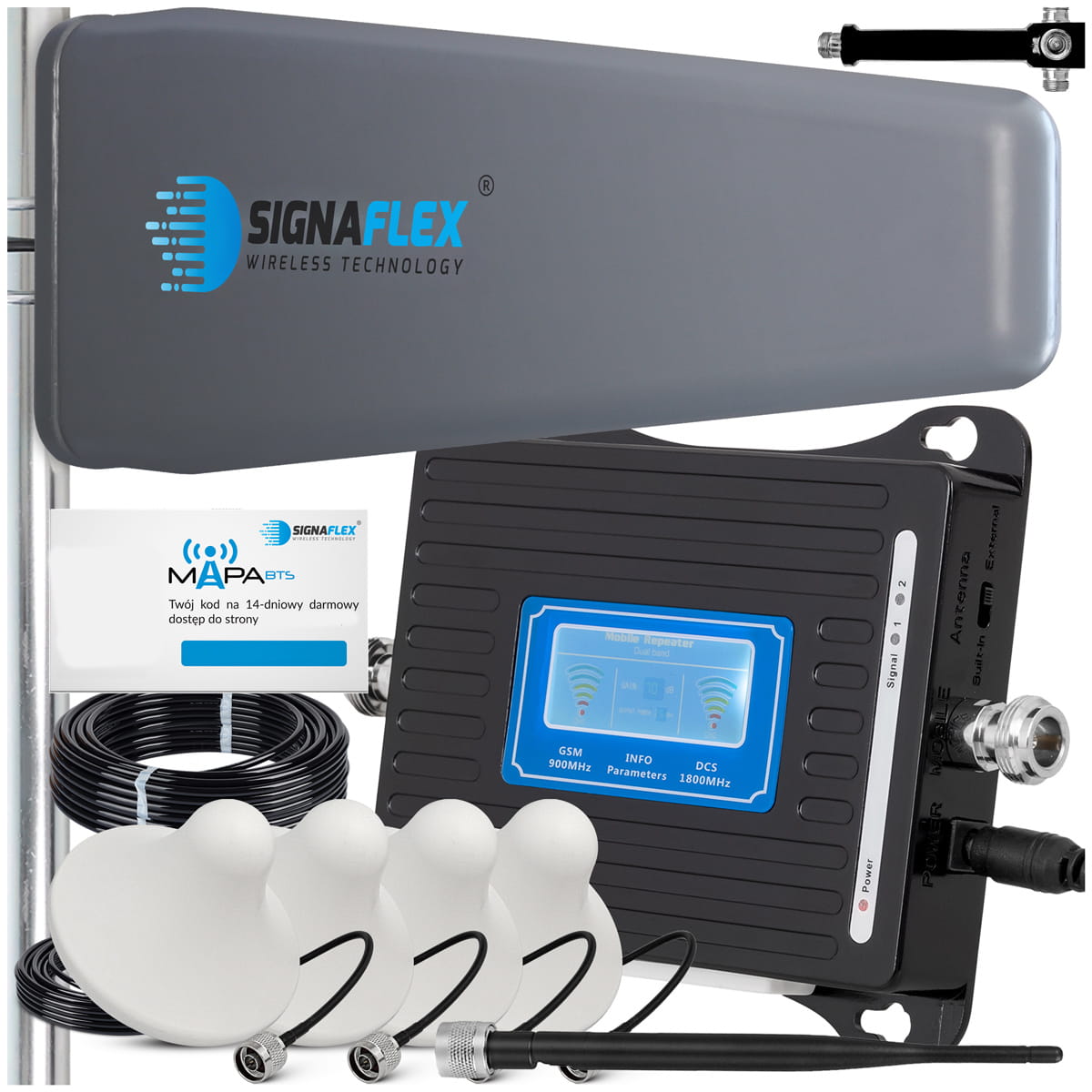 Zestaw Wzmacniacz GSM/DCS LCD3000 LS-GD22 + T2 23dBi 10m + 4x Grzybek + Bat