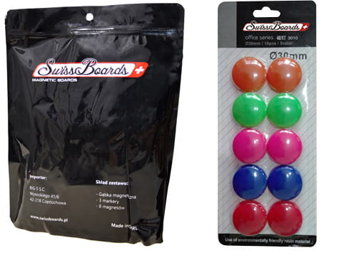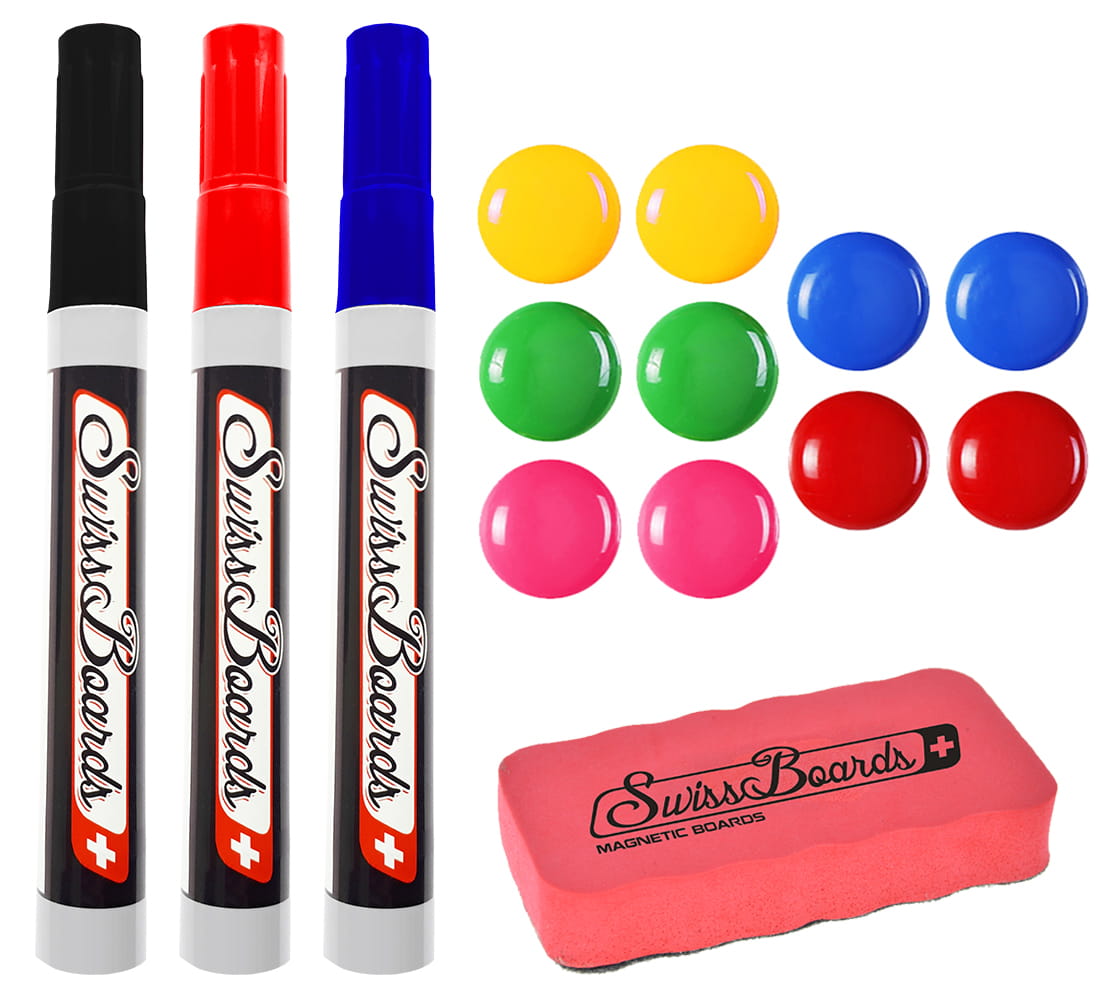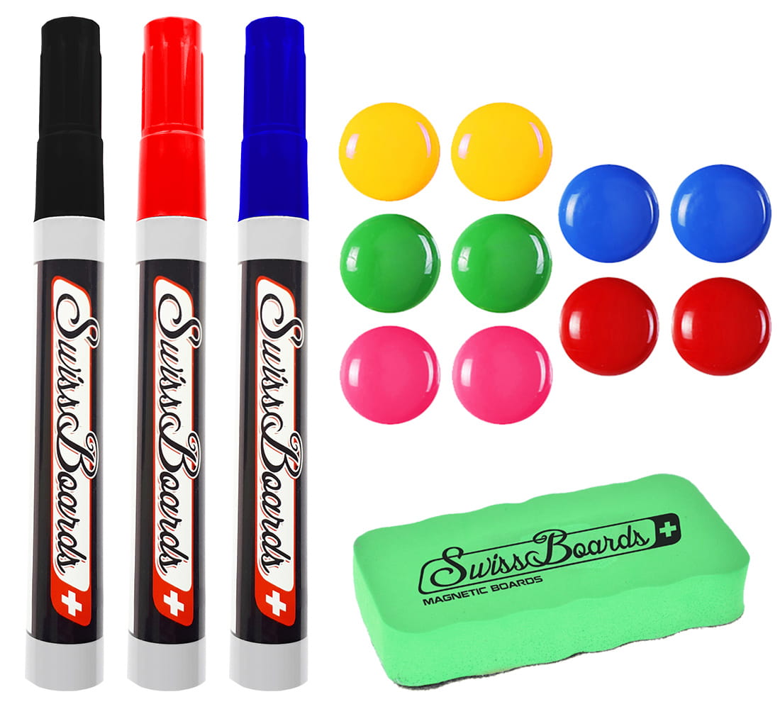 Zestaw akcesoriów do tablic suchościeralnych SwissBoards - markery, magnesy i gąbka do łatwego czyszczenia